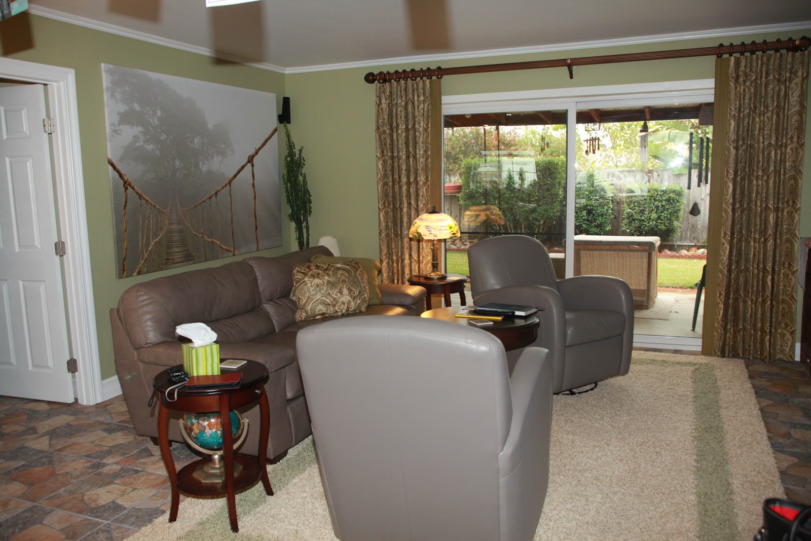 (Above) - This is what the family room looked like the first time I arrived. Naked floors, walls and windows. We helped by dressing the windows and putting a warm color of green on the walls.